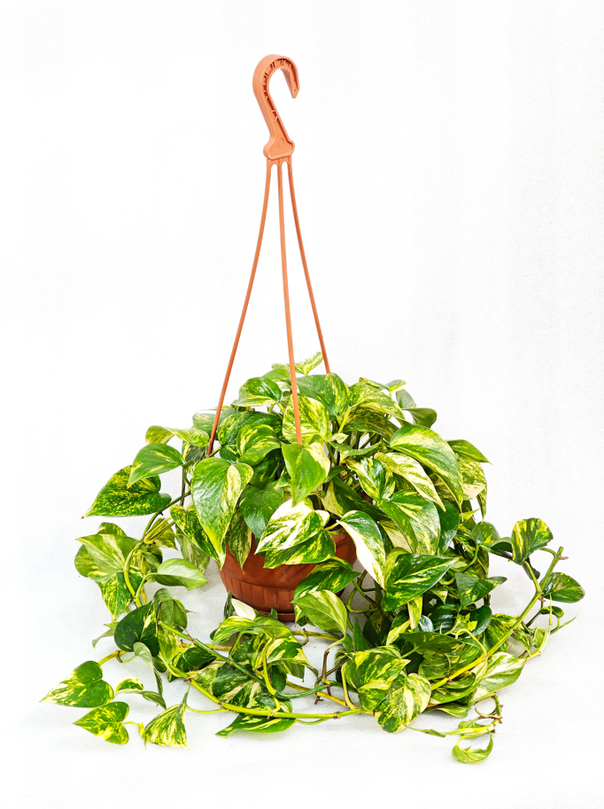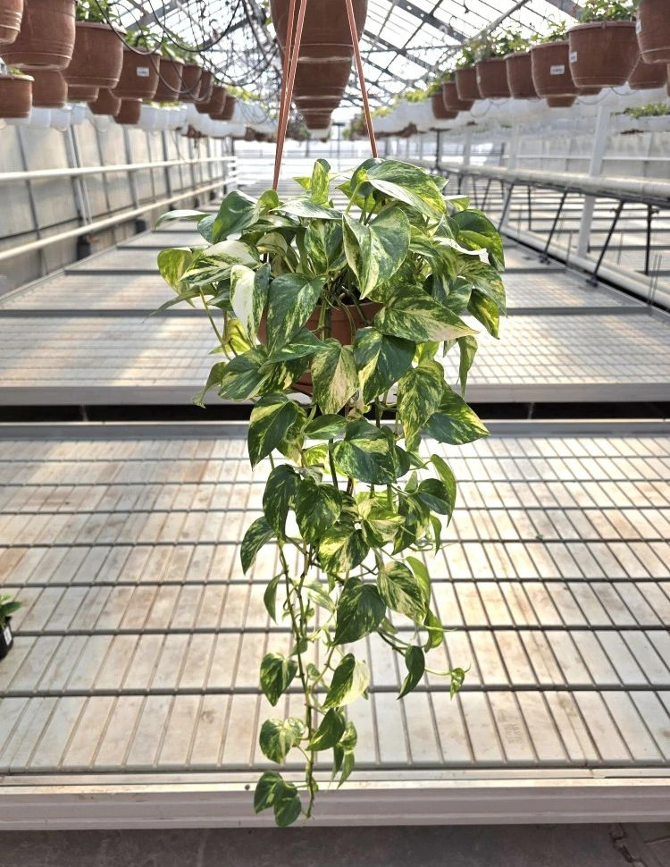 Род: Эпипремнум (Epipremnum). Вид: Эпипремнум золотистый (Epipremnum aureum). Тип роста: Вечнозеленая лиана. В комнатных условиях длина побегов достигает 2–5 м (при регулярной обрезке может быть компактнее). В природе — до 15–20 м. Лиана (вечнозеленая, быстрорастущая). Особенности: Наличие воздушных корней для опоры; листья с желтоватыми или белыми пятнами и мраморным рисунком (пестролистные формы); в домашних условиях цветет крайне редко.